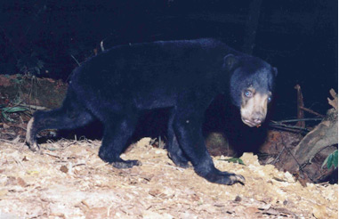 三日目、ちり捨て場近くに観察台を設け、暗くなってから、到来を待ちました。21時40分、地上に置いた自動カメラが作動するのを確認し、ライトを点けました。どうでしょう。いました。マレーグマです。しかも2頭一緒です。まだ仔どものようです。 2頭は、じきにチリ捨て穴にもぐってしまいました。完全に姿が見えなくなり、蓋をしたら、捕らえることができるくらいです。 その後、穴の周囲をうろついたり、再び穴に潜ったりもしましたが、やがて斜面を下って行きました。ところが、少し行った所で止まり腰をおろしました。一休みのようです。ひっきりなしに舌で口のまわりをなめたり、手を使って吻をぬぐったりしています。2頭が、お互いの体をなめあったりもします。 2頭は、その後も2時間おきくらいに到来しました。木の上の器材が気になるのか、立ち上がって木を揺らしたり、地上のカメラにも鼻をつけてにおいを嗅ぐこともありました。 マレーグマはアッサムから中国南部、インドシナ、マレーシア半島、スマトラ島、ボルネオ島に分布。世界で最も南に分布するクマです。学名と英名は「太陽のクマ」を意味し、マレー語名は「蜂蜜のクマ」という意味です。 ボルネオ島では、ほぼ全島的に分布。標高1300メートルくらいにまでの十分に生長した大きな森林に棲息しています。耕作地や明るい灌木林にはいません。 世界のクマの中で最も小さく、オトナで頭胴長90~120センチメートル、尾長3~9センチメートル、体重は48~60キログラムで、がっしりした体の造りをしています。体毛は短く、全体に黒色。胸上部に白っぽい斑点かV字状の斑紋があります。かなり嗅覚が効くようですが、視覚と聴覚はそれほどでもないようです。 主に夜行性ですが、昼でも活動することがあるようで、 私も日中、地上20メートルの高さに登っていた1頭を見たことがあります。 食べ物はハチの巣、シロアリ、昆虫の幼虫、小動物などで、ハチの巣はまるごと食べています。これらを探す時は、強力な爪や犬歯を使って、木を引き裂いています。また、果実もかなり重要な食べ物です。 その後、観察はキャンプを移動するまで4晩続けられましたが、最初の晩にちょっとだけ見たクマとの再会は実現しませんでした。 和名/マレーグマ 英名/Sun bear マレー語名/Beruang Madu |