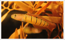 キヌバリはハゼの仲間で飴色の体色に横縞模様も涼やかなとても美しい魚で、太平洋側ではこの縞が6本で日本海側では7本と数が違うことで有名です。 more >>