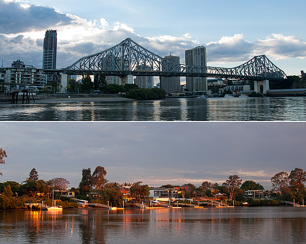 船から眺めるブリスベンの街(上)。夕暮れの川岸の様子。どの家にも、ボート用の桟橋があった(下)
