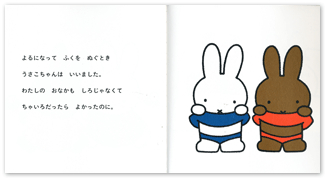 子どもは成長するにつれ、自分以外の他人に興味や関心をいだきはじめること。それは、自分との違いや同じところを発見することにつがっていくこと。そして、自分と違うところをうらやましく思ったり、同じであることを嬉しく思ったり。そんな、他人との関係性の一歩を、うさこちゃんがふみ出したことを伝えたかったのではないかと…。そう考えると、友だちと一見、見分けがつかなく描かれている『うさこちゃんおとまりにいく』のうさこちゃんは、この一歩をまだふみ出していない、幼いうさこちゃんだったのかもしれません。
